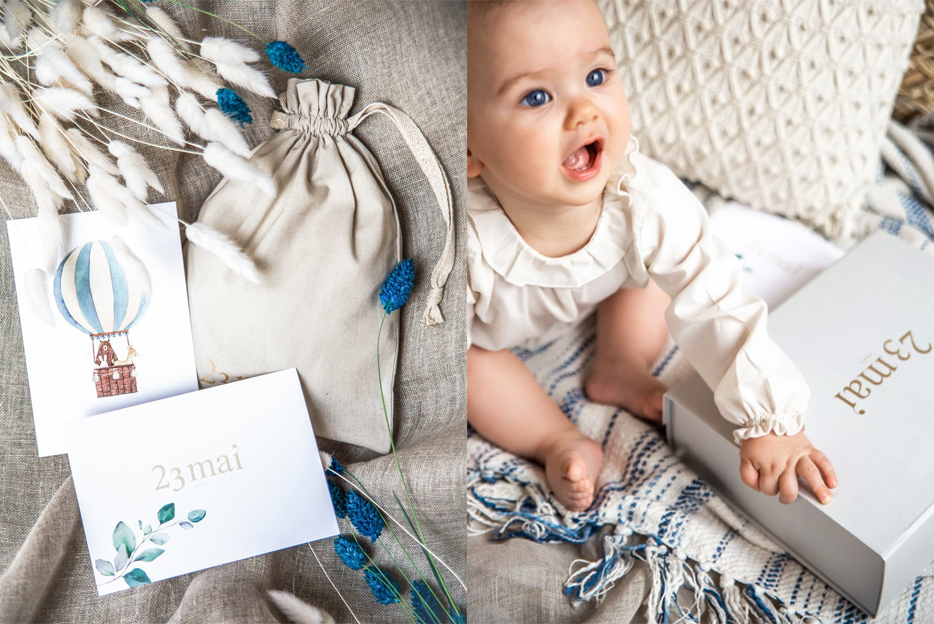 Logo, charte graphique, packaging, shooting, DA du e.shop, supports de communication pour des coffrets de naissance personalisés pour enfant.